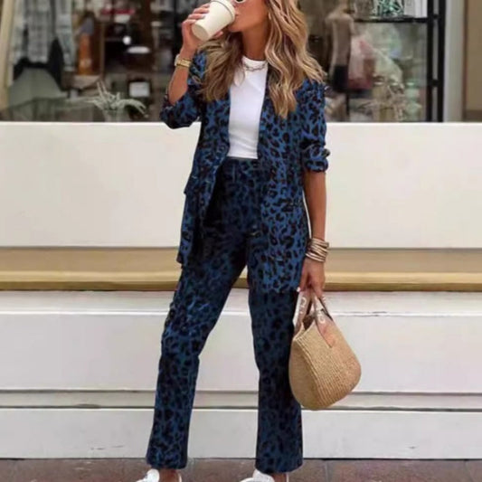 Leopard Print Lapel Long Sleeve Top High Waisted Pants Set