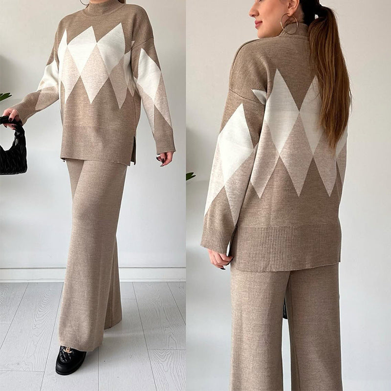 Fashion Color-blocking Rhombus Sweater & Pants Set
