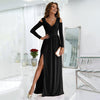 Women's long dress:Sexy midi dress with deep V-neck, long sleeves, maxi length, side slit and pleated high waist