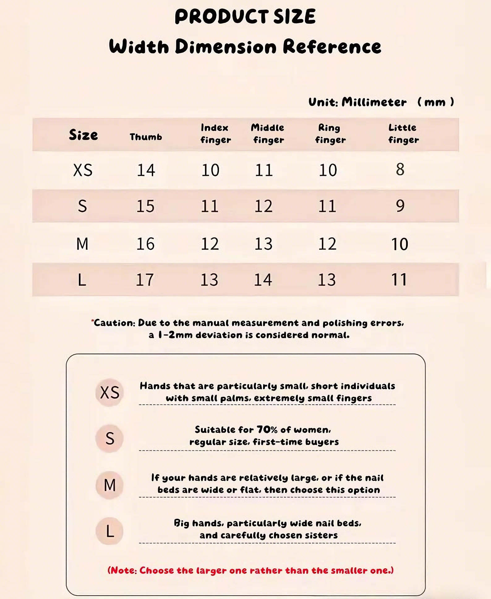 - L: For chubby hands, extra wide nail beds; choose cautiously